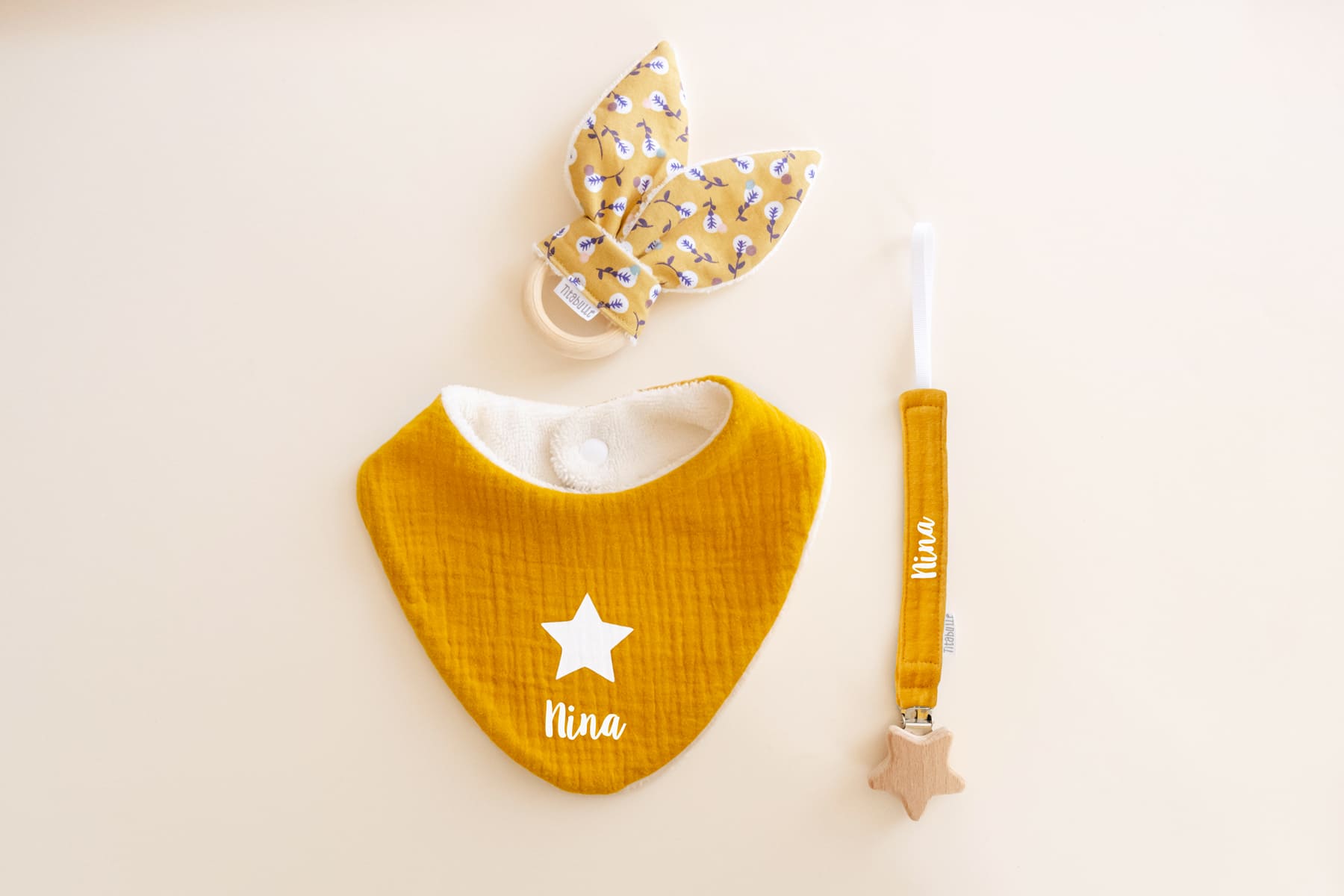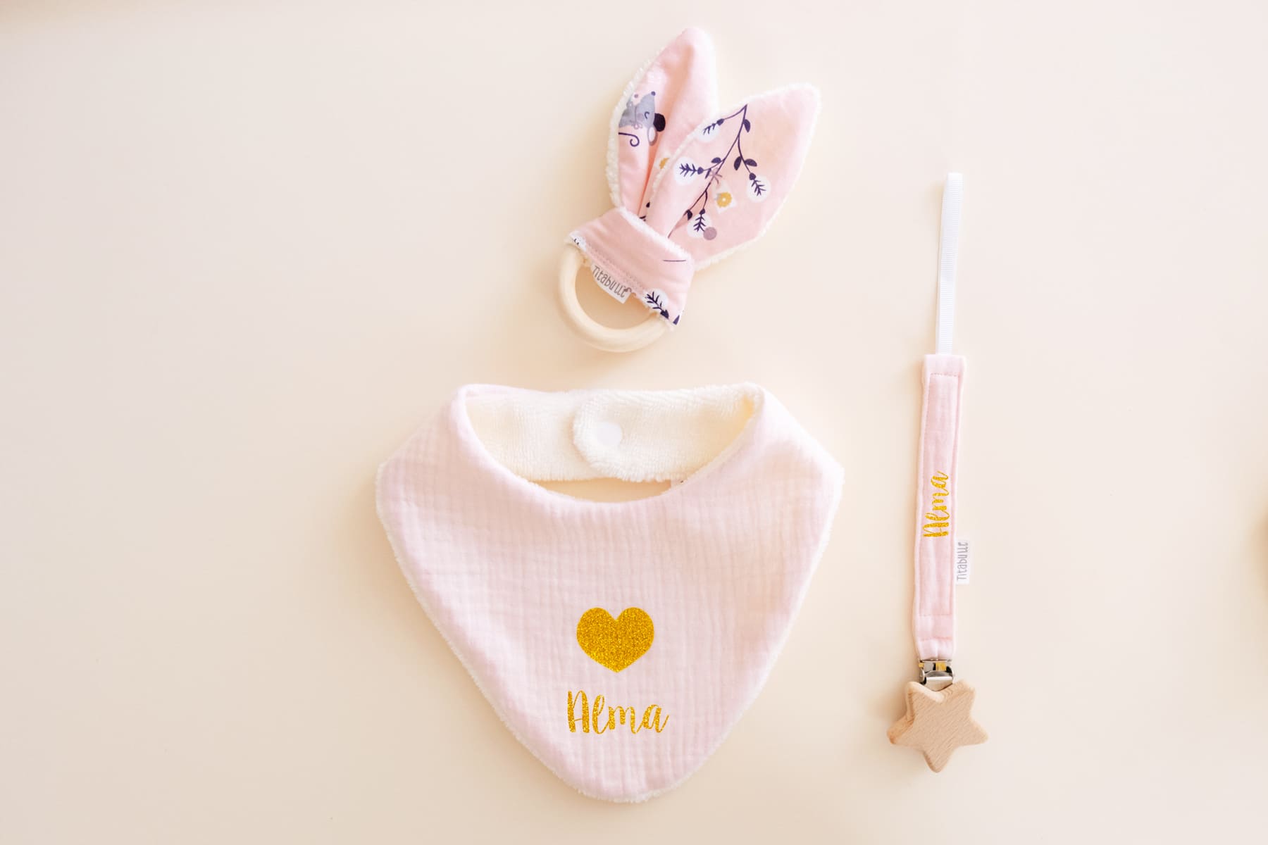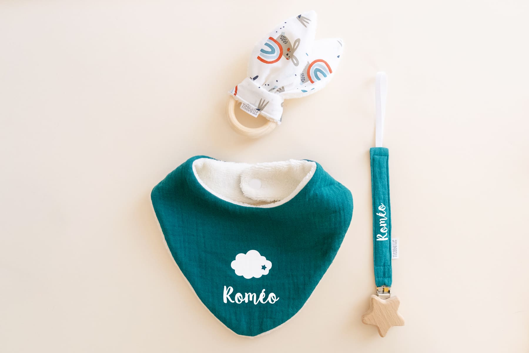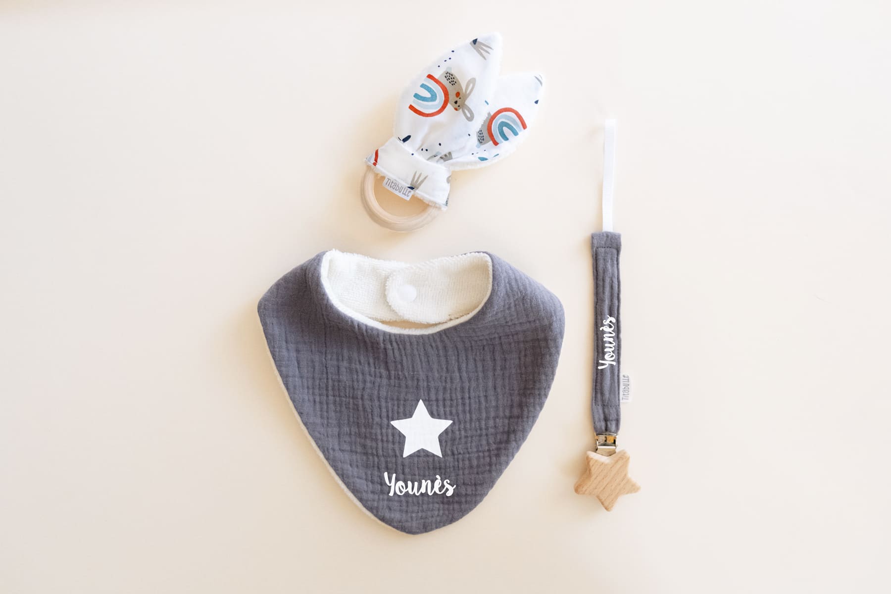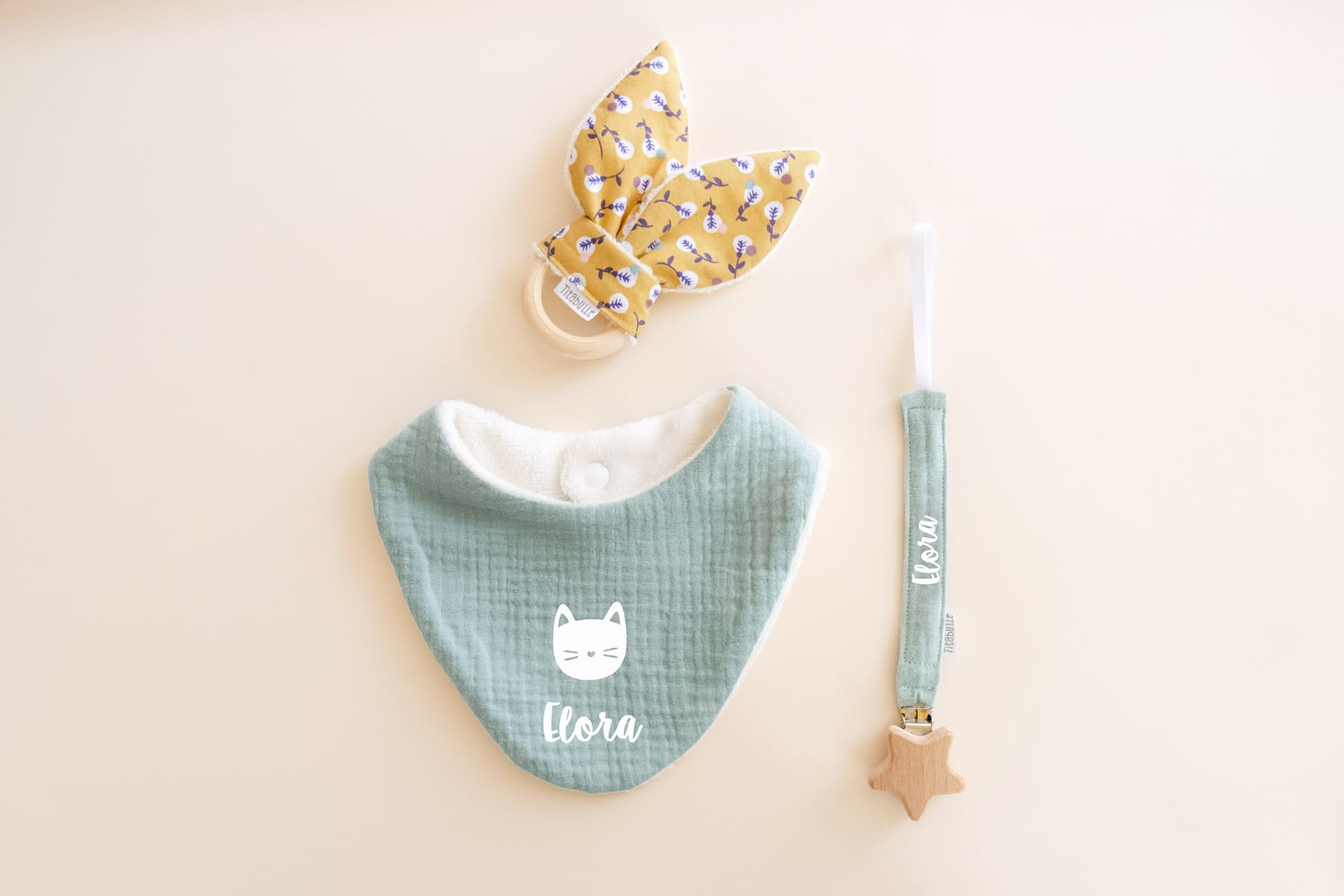 Vous pouvez faire personnaliser le bavoir et l’attache-tétine avec le prénom de votre choix pour rendre votre cadeau unique.