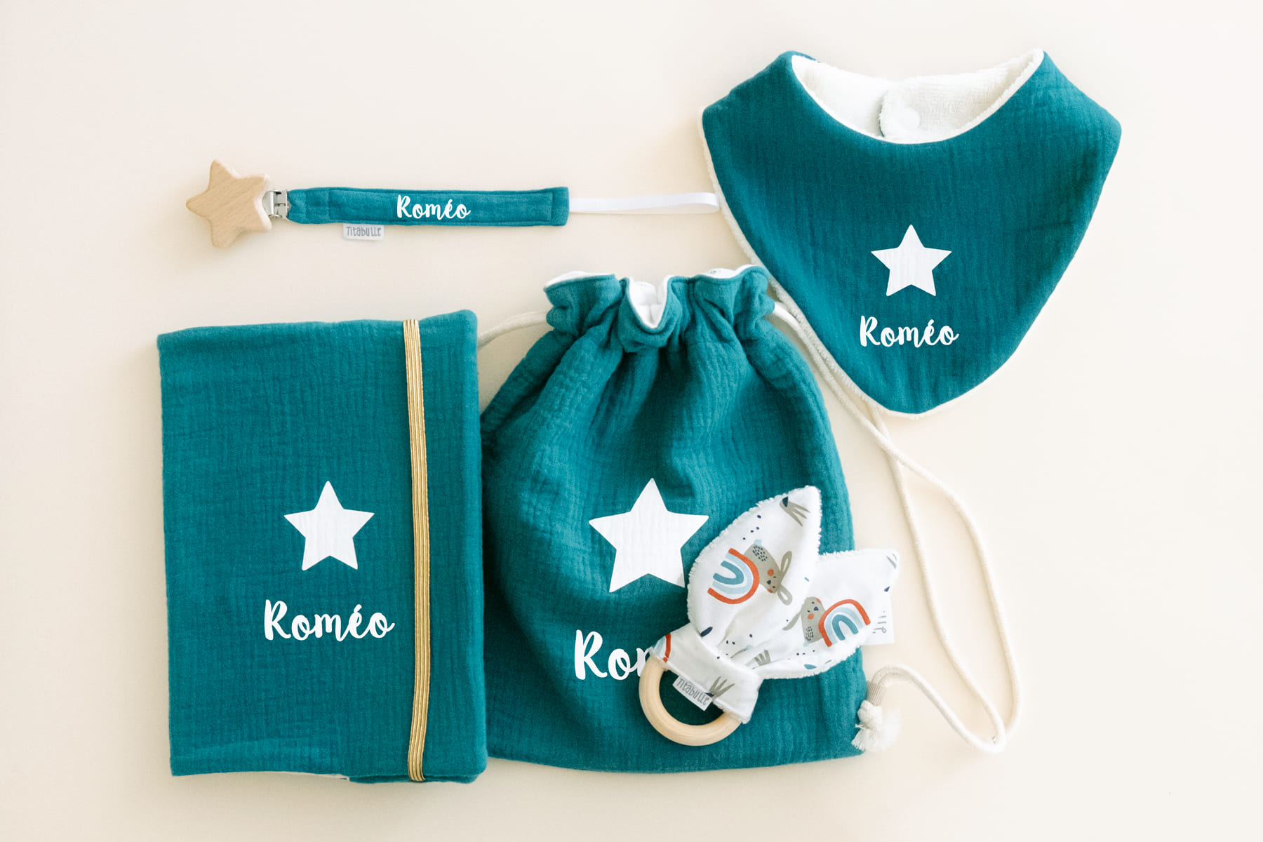 Vous pouvez faire personnaliser tous les éléments avec le prénom de votre choix pour marquer l’événement (sauf l’anneau de dentition).